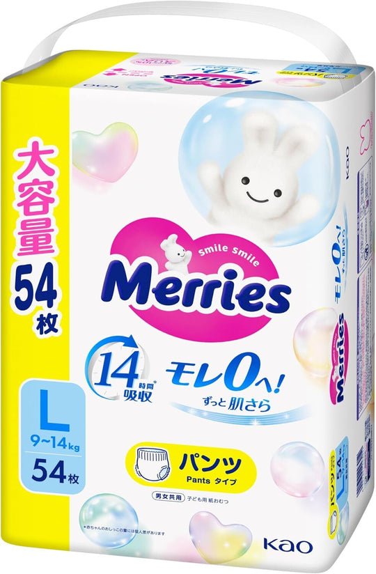 MERRIES sauskelnės-kelnaitės, L, 9-14 kg, 54 vnt.